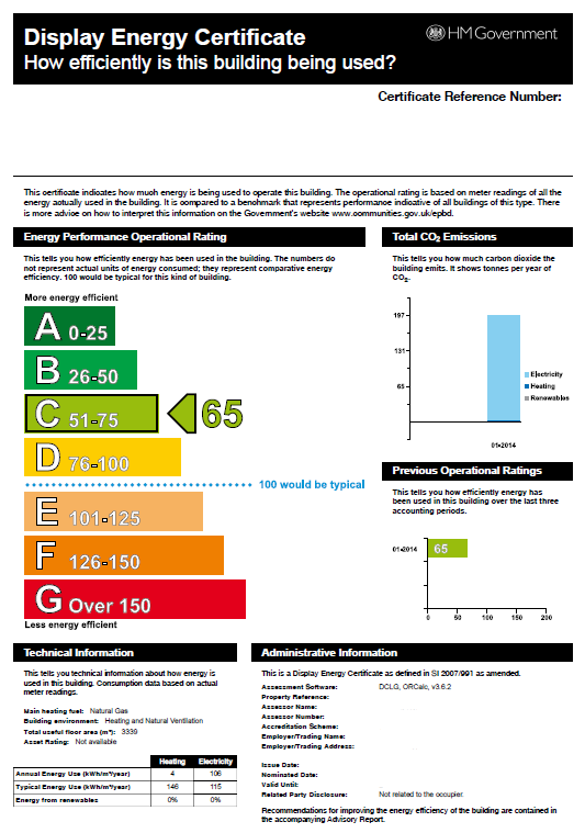 A Display Energy Certificate or DEC shows a buildings energy performance rating over the last 12 months. The rating is an indication of the buildings CO2 emissions over the previous year. The DEC produced for a large building will show ratings for the previous two years. The DEC should be displayed in a place that is clearly visible to members of the public and should be no smaller than A3 size.